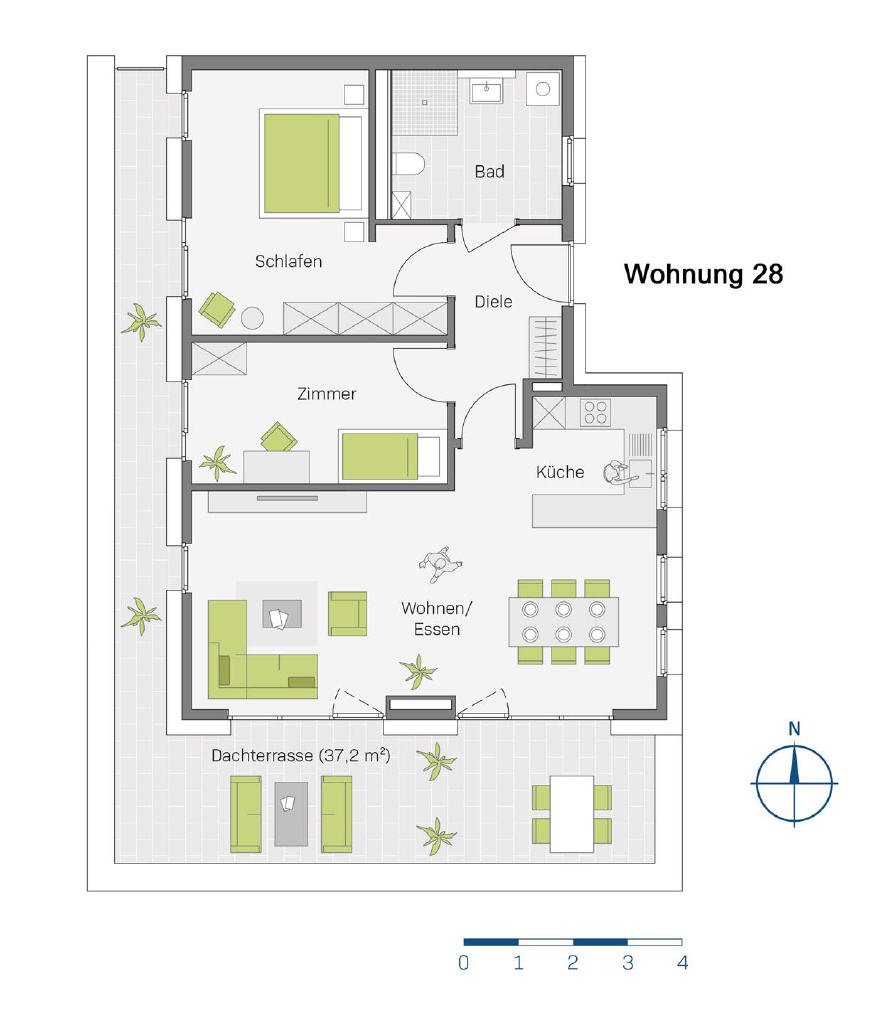 In den zwei Gebäudeteilen, die über Laubengänge miteinander verbunden sind, entstehen 31 Wohnungen für Betreutes Wohnen und ein Gemeinschaftsraum. Den Betreuungsservice im Haus wird die Christophorus-Gemeinschaft e.V. übernehmen.