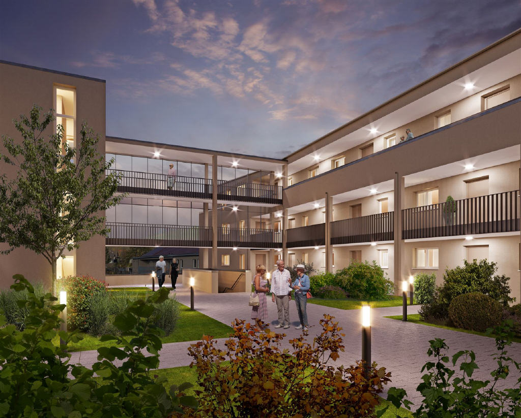 In den zwei Gebäudeteilen, die über Laubengänge miteinander verbunden sind, entstehen 31 Wohnungen für Betreutes Wohnen und ein Gemeinschaftsraum. Den Betreuungsservice im Haus wird die Christophorus-Gemeinschaft e.V. übernehmen.