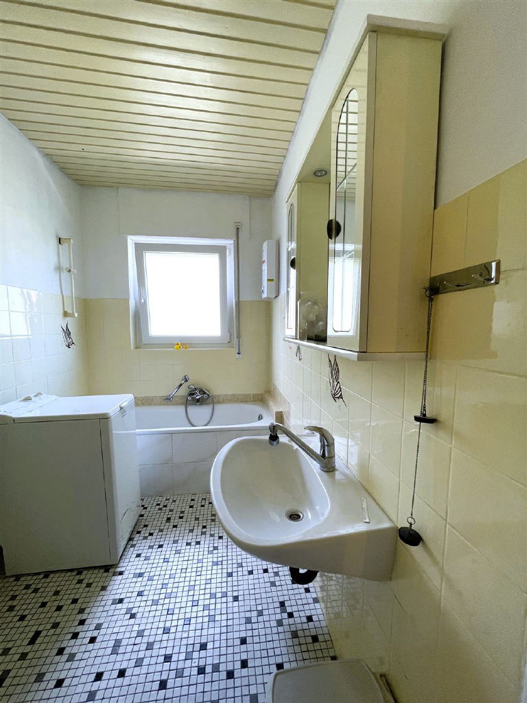 Das Tageslichtbad mit Badewanne, Waschbecken und Waschmaschinenanschluss bietet ausreichend Platz für einen entspannten Start in den Tag. Ihre Badeutensilien finden bequem Platz in der integrierten Abstellkammer. Ein frisch renoviertes Gäste-WC aus dem Jahr 2023 ergänzt den durchdachten Grundriss.