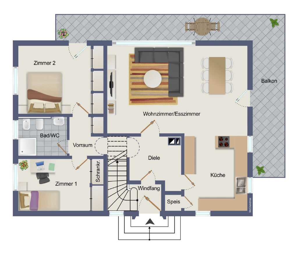 Drei moderne Bäder jeweils mit ebenerdiger Dusche, eines zusätzlich mit bequemer Badewanne, sorgen für Komfort. Ergänzt wird das Angebot durch zwei Balkone und eine sonnige Terrasse perfekte Orte zum Entspannen im Freien.