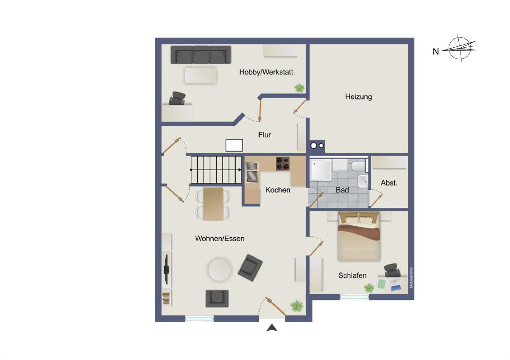 Im Keller des Hauses befindet sich neben einem großen Hobbyraum der Heizraum und ein Abstellraum.