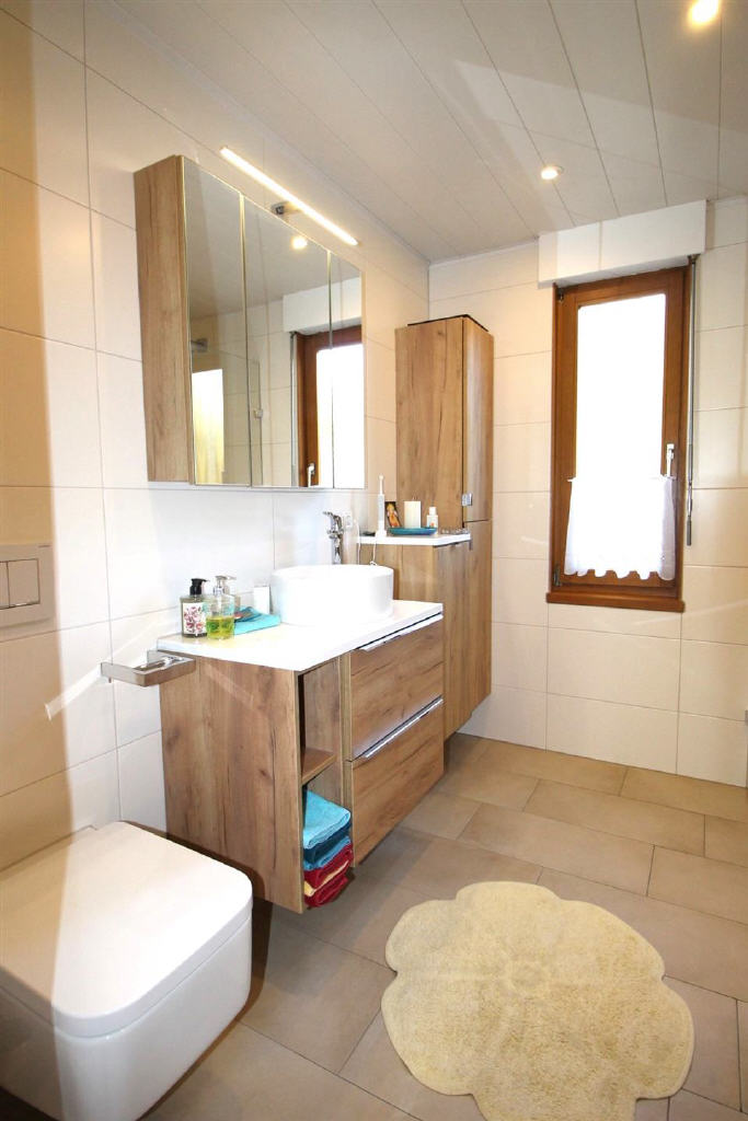 Das Erdgeschoss umfasst 3 Zimmer auf ca. 95 m². Das Wohn-/Esszimmer mit modernem Raumteiler und Erker führt auf den großzügigen Eckbalkon, der nach Süd-Westen ausgerichtet ist und atemberaubende Sonnenuntergänge bietet. Ein moderner Kachelofen aus dem Jahr 2023 schafft eine gemütliche Atmosphäre. Die Küche ist mit einer Einbauküche ausgestattet und das Badezimmer wurde 2020 saniert.