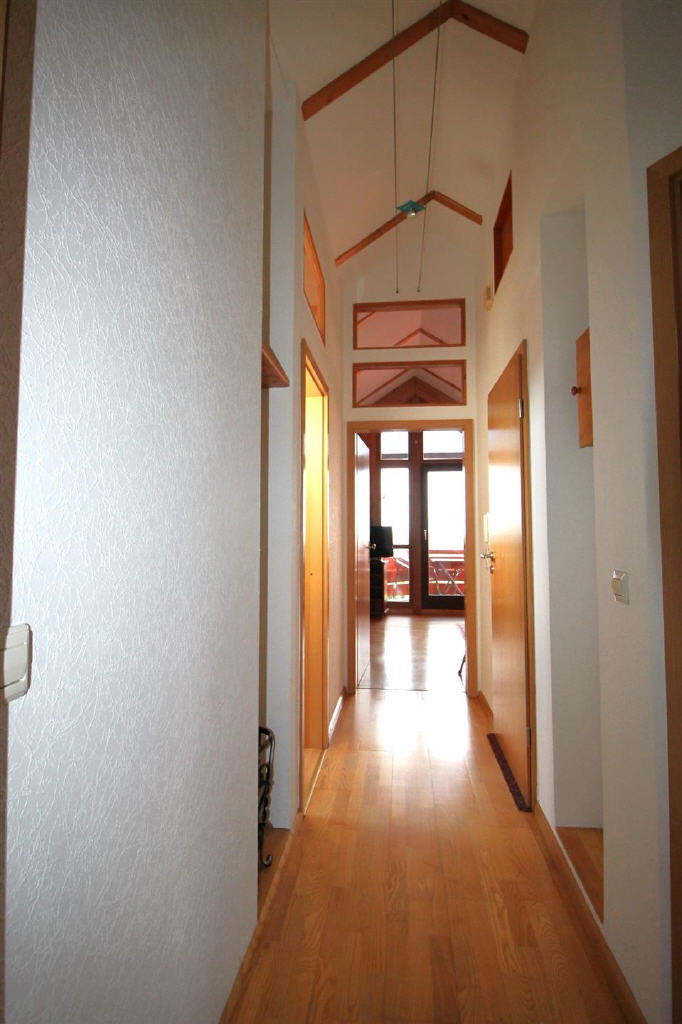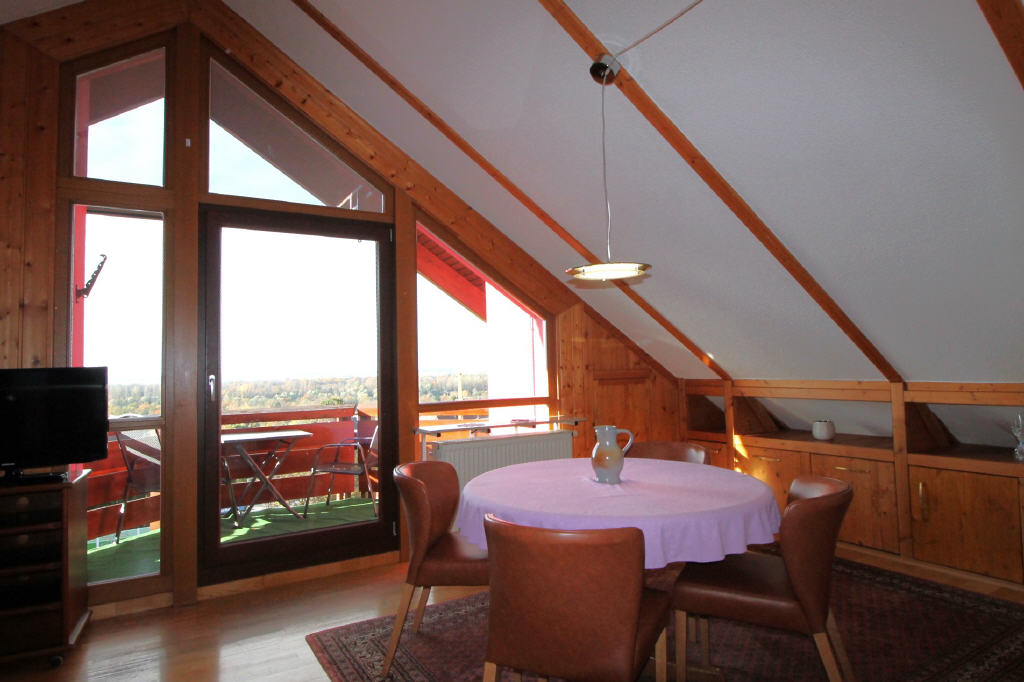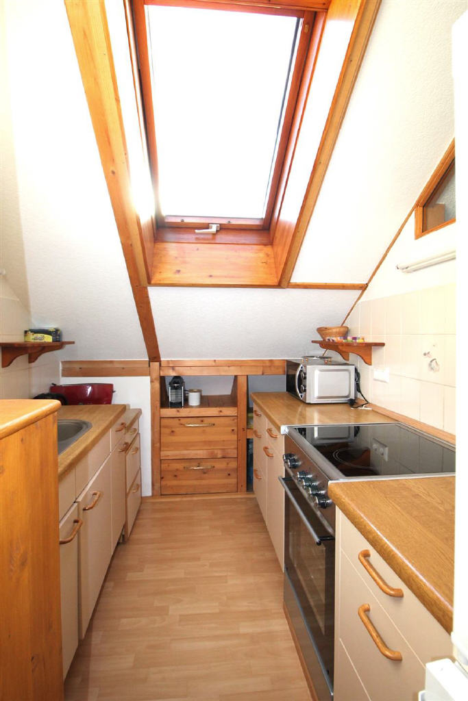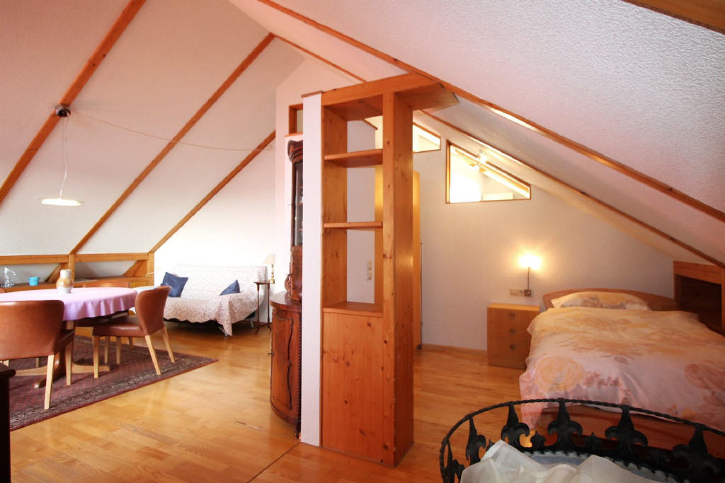 Im Dachgeschoss befinden sich auf ca. 53 m² Wohnfläche eine Küche, ein Badezimmer, ein Schlafzimmer und ein großes Wohnstudio mit Balkon nach Westen und freiem Blick in die Vogesen. Dieses Geschoss eignet sich z. B. auch als Seniorenwohnung.